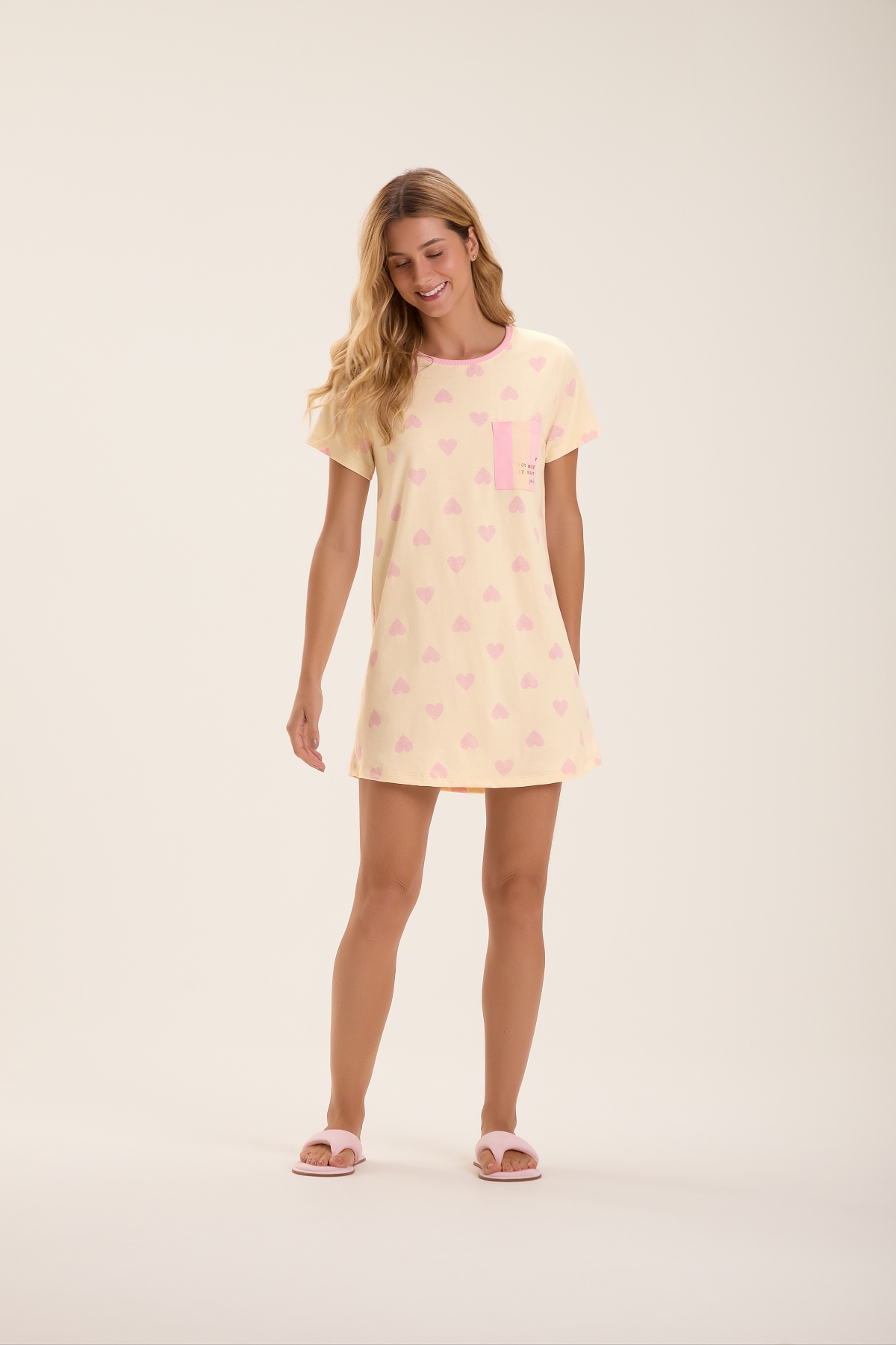 | Camisola manga curta, feita em malha comfort para garantir um toque suave e agradável. O bolso tem uma estampa localizada com a frase "Você faz meu coração sorrir", trazendo um charme especial tornando esta peça confortável e cheia de estilo. Camisola pensada para proporcionar bem-estar com beleza e leveza, ideal para quem ama transformar o descanso em um momento especial. |