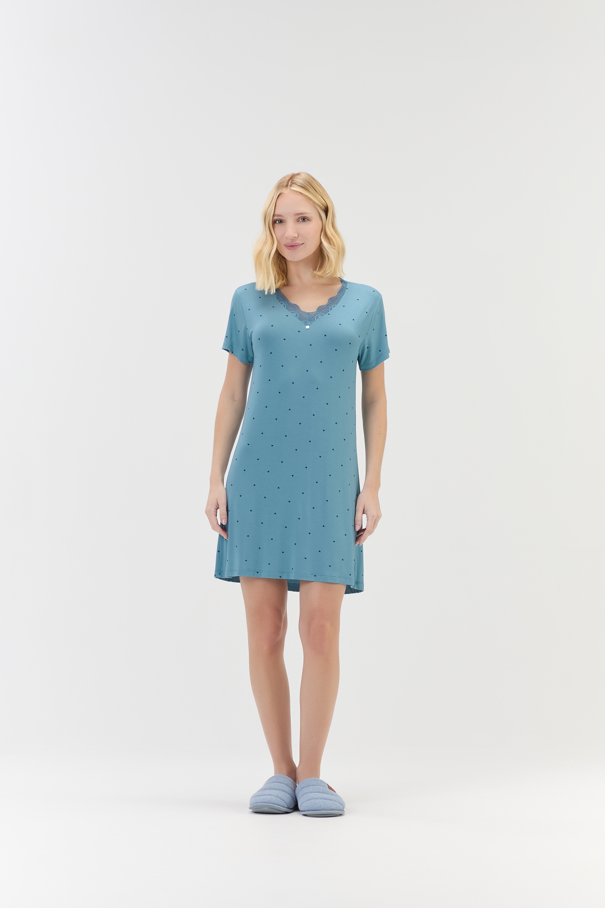Delicada, fresquinha e cheia de charme. Confeccionada em malha visco comfy, essa camisola oferece toque macio, caimento leve e muito conforto para as suas noites. Com fundo azul e estampa rotativa de mini corações em tom sur tom, traz um visual romântico e discreto. O destaque fica por conta do decote V com detalhe em renda na mesma cor da malha, que adiciona feminilidade na medida certa. Ideal para quem busca suavidade e estilo ao dormir ou relaxar em casa. Modelo veste tamanho P. |