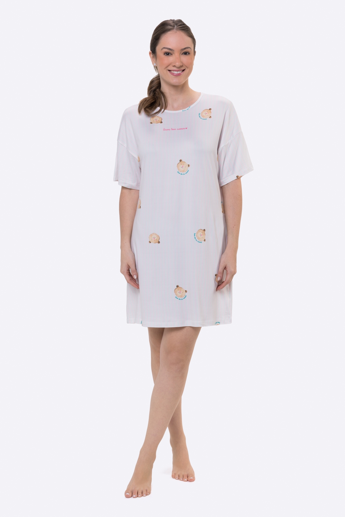 Delicada e cheia de charme, esta camisola feminina de manga curta é ideal para noites de descanso com muito conforto. O modelo possui caimento reto, gola redonda e mangas soltinhas, proporcionando liberdade de movimento e um toque leve ao vestir. Na cor branca, a peça ganha destaque com sua estampa fofa de ursinhos espalhados por toda a camisola, criando um visual suave, divertido e superfeminino. O detalhe de escrita na parte frontal complementa o estilo com um toque moderno. Confeccionada em tecido macio e respirável, oferece sensação suave na pele, perfeita para noites tranquilas e uso diário. |