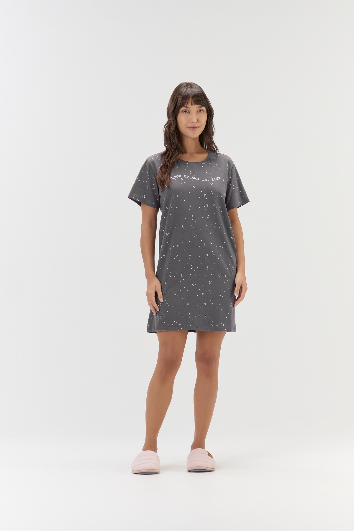 Delicada, confortável e com um toque de magia. Confeccionada em malha comfort, essa camisola oferece toque macio e caimento aconchegante, ideal para noites tranquilas. O fundo cinza é acompanhado por uma estampa rotativa de mini meia-luas e pequenas estrelas em tons de rosa e off-white, criando um visual leve e sonhador. A camisola de manga curta traz estampa localizada com a frase “Look up and get lost” (Olhe para o alto e se perca), que adiciona um charme sutil à peça. Perfeito para quem sonha alto e valoriza conforto com poesia nos detalhes. Modelo veste tamanho P. |