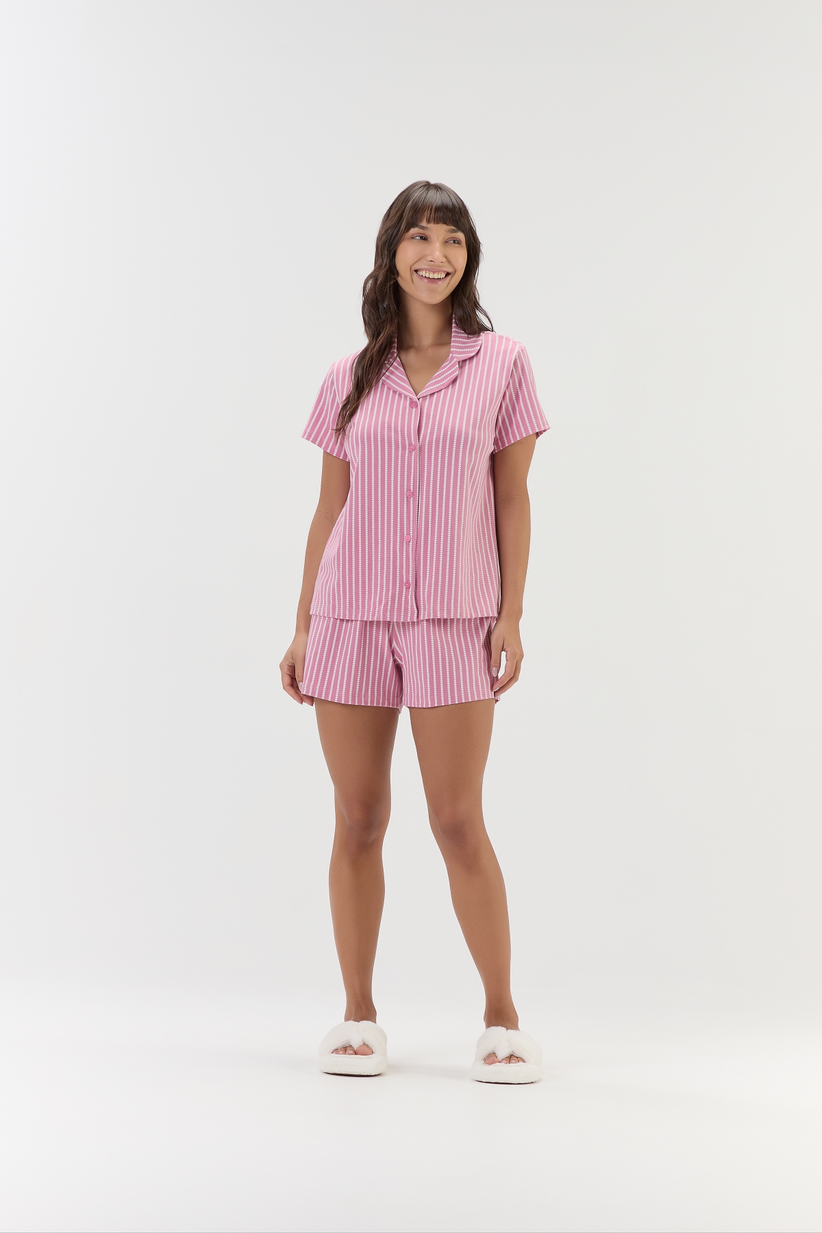 Leve charme e conforto para seus momentos de descanso com este pijama americano. Confeccionado em malha comfort macia e respirável, proporciona toque suave e liberdade de movimento para relaxar em casa ou aproveitar os fins de semana tranquilos. A blusa de manga curta apresenta fundo rosa e uma estampa delicada de listras verticais formadas por mini corações, trazendo um visual delicado e divertido. O shorts combinando garante conforto e praticidade, completando o conjunto de maneira charmosa. Modelo veste tamanho P. |