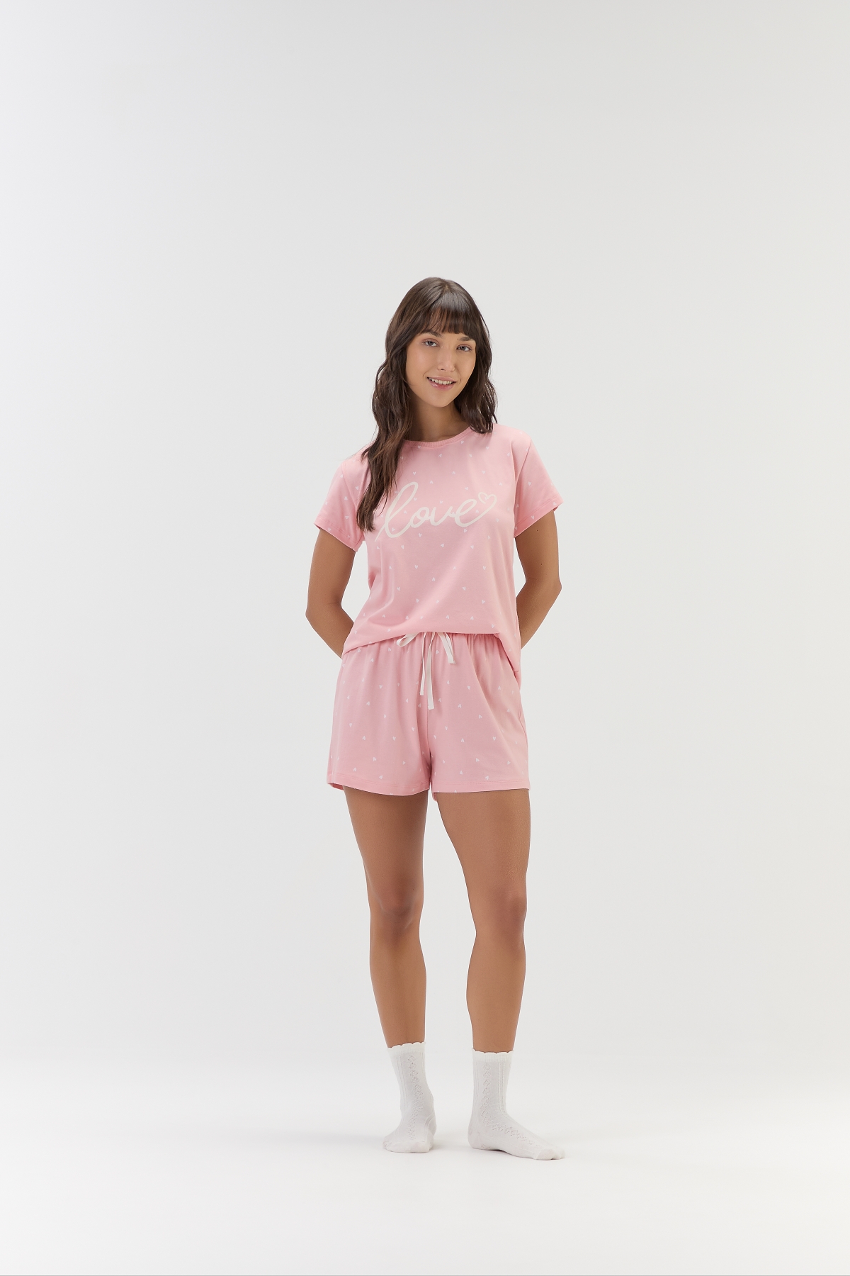 Pijama feminino de manga curta com shorts, confeccionado em malha comfort macia e leve, proporcionando frescor e aconchego para as noites de descanso. O conjunto apresenta fundo rosa-claro com estampa rotativa de mini corações off-white, que deixam a peça delicada e romântica. A blusa, com modelagem levemente ampliada para mais conforto, traz estampa localizada da palavra “Love” (“Amor”), adicionando um toque simples e encantador ao visual. O shorts possui cós com elástico confortável e detalhe em laço decorativo em fita de poliamida na cor off-white, que complementa o conjunto com charme e feminilidade. Um pijama leve, fofo e aconchegante, perfeito para noites de sono tranquilas ou momentos relaxantes em casa. Modelo veste tamanho P. |