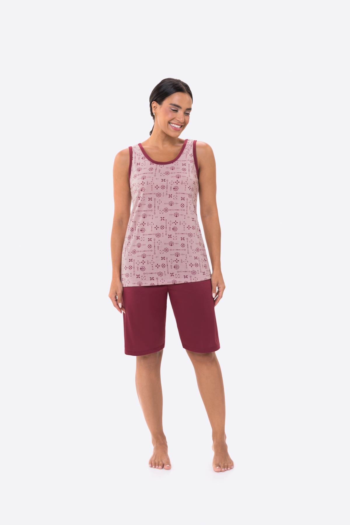 Este pijama feminino de estilo senhoril oferece o equilíbrio perfeito entre elegância discreta e frescor para as noites de descanso. O conjunto é confeccionado em Noble Touch, garantindo um toque extremamente macio, leveza e durabilidade superior. A blusa em modelo regata apresenta uma estampa geométrica delicada em tons de rose e vinho, com acabamento em viés no decote redondo que proporciona um ajuste confortável. A bermuda, em comprimento clássico e discreto na cor vinho sólido, possui cós elástico que se adapta suavemente ao corpo sem apertar. Com uma modelagem pensada para o bem-estar e liberdade de movimento, este pijama é a escolha ideal para quem busca praticidade e sofisticação no homewear cotidiano. |