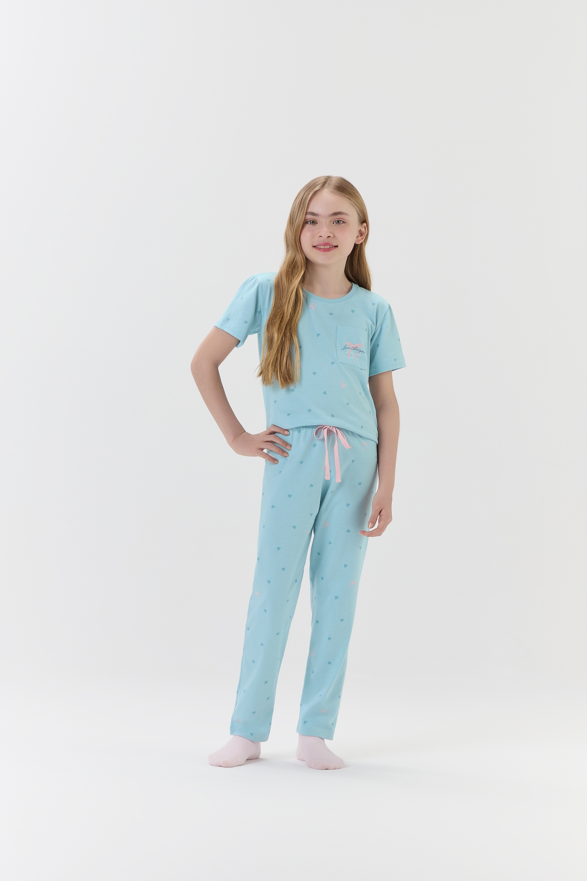 Um pijaminha cheio de carinho para deixar as noites ainda mais aconchegantes! Confeccionado em malha comfort macia e fresquinha, esse conjunto traz estampa rotativa de corações em tom sur tom sobre fundo azul claro, com laços cor-de-rosa espalhados que deixam tudo ainda mais delicado. A blusinha de manga curta tem um bolsinho fofo com estampa de laço e a frase: "Love always for those who inspire us” (Amor sempre para aqueles que nos inspiram), perfeita para espalhar amor por onde passar. A calça tem modelagem cenoura, confortável e estilosa, com detalhe de cadarço decorativo rosa na cintura. Ideal para dormir com muito conforto e acordar com ainda mais doçura! Modelo veste tamanho 8. |