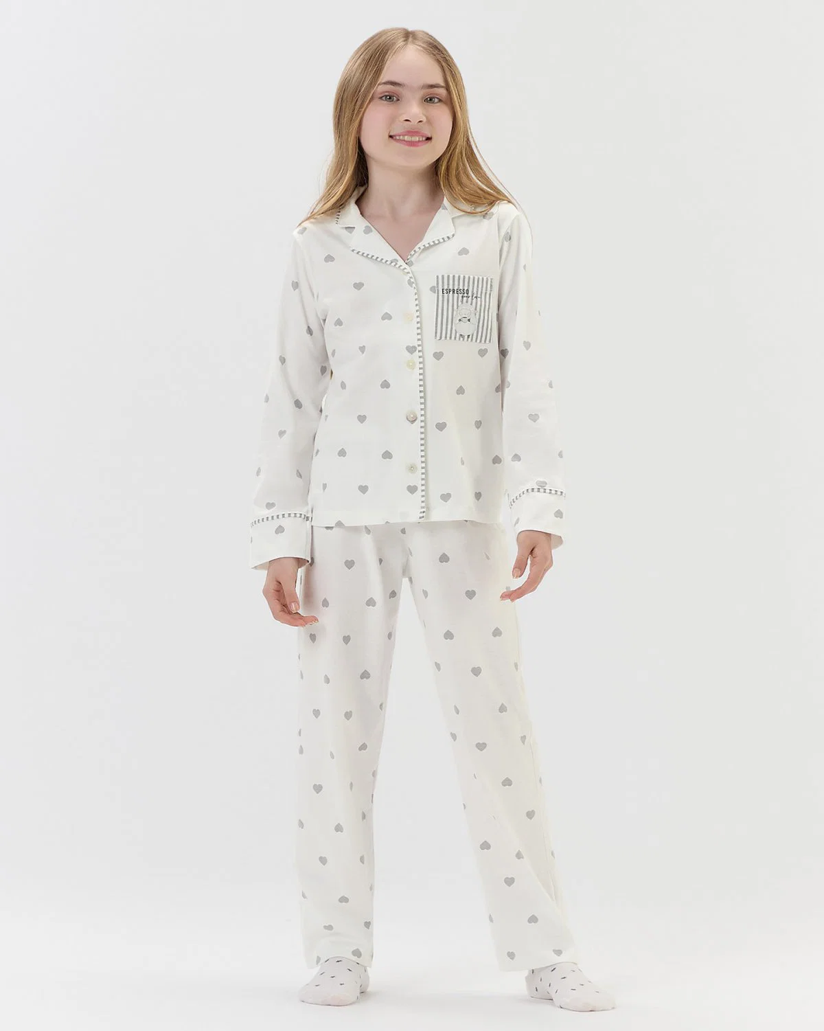 PIJAMA FEMININO JUVENIL MANGA LONGA COM BOTÕES E CALÇA BRANCO - COR COM AMOR