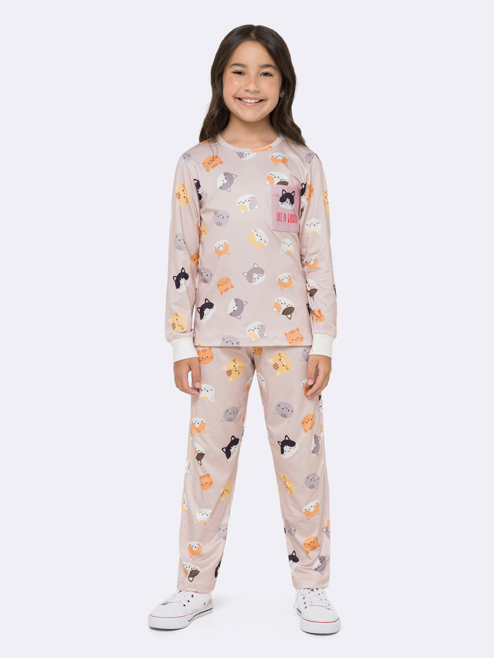 PIJAMA FEMININO JUVENIL MANGA LONGA E CALÇA BEGE GATOS - VEGGI