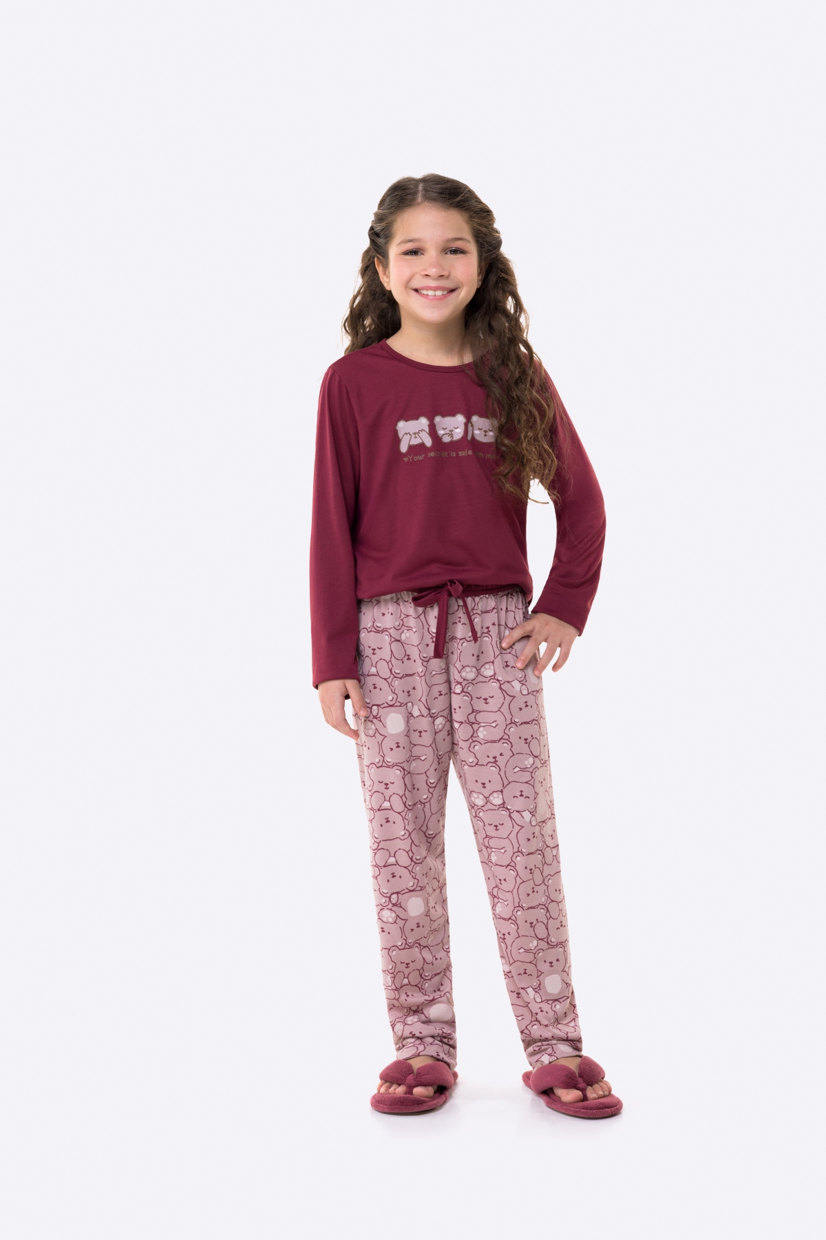 PIJAMA FEMININO JUVENIL MANGA LONGA E CALÇA VINHO URSO - BOCEJINHO