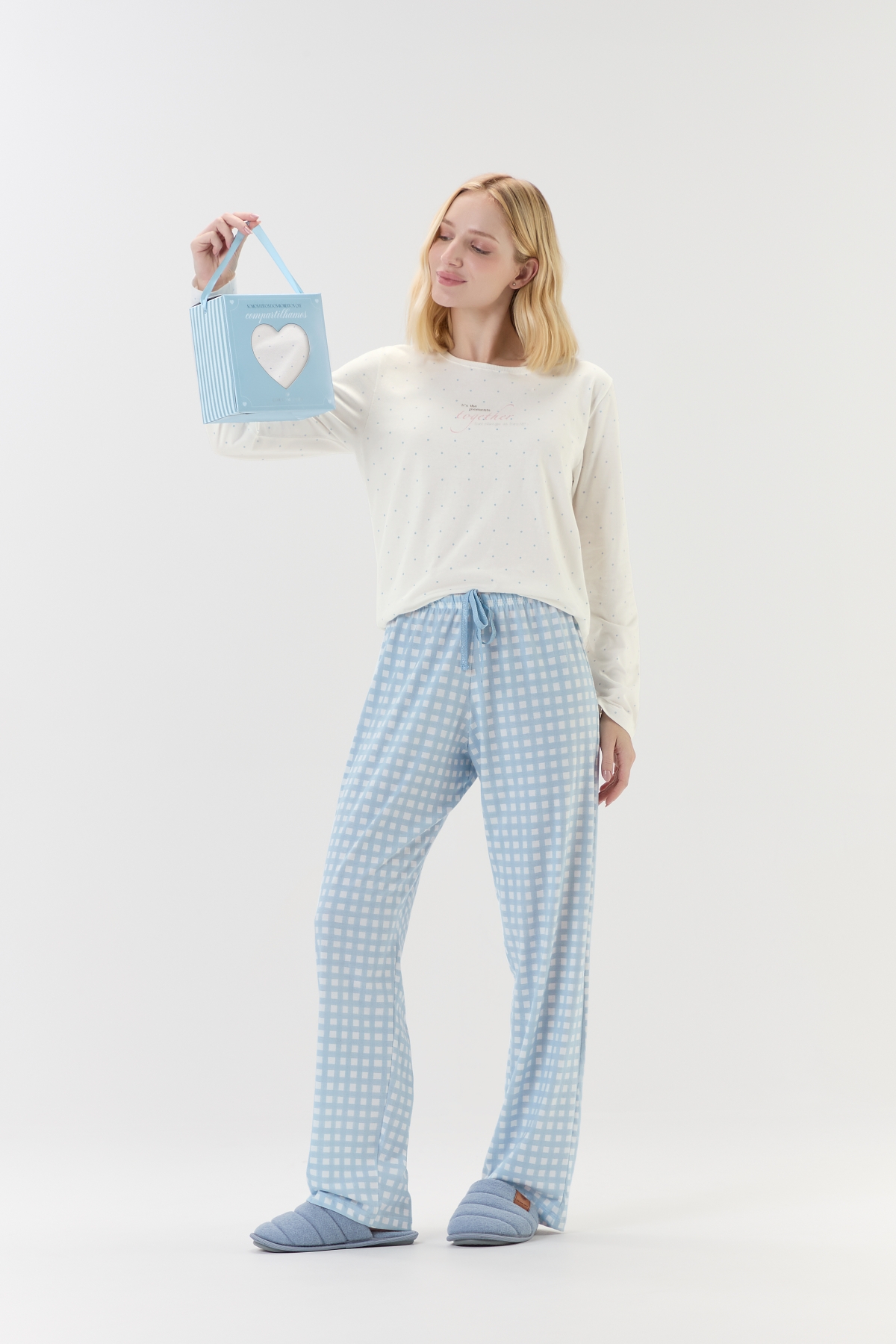 PIJAMA FEMININO MANGA LONGA E CALÇA AZUL XADREZ FAMÍLIA - COR COM AMOR