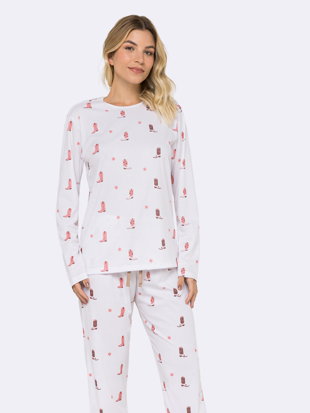 PIJAMA FEMININO MANGA LONGA E CALÇA CANELADO BRANCO BOTAS - VEGGI