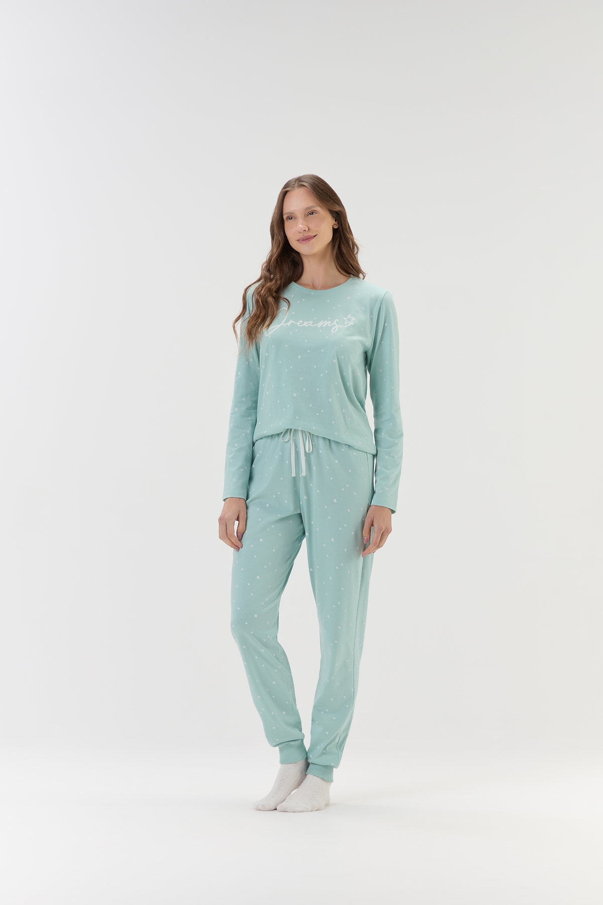 | Pijama feminino de manga longa com calça, confeccionado em malha comfort macia e leve, garantindo aconchego e liberdade de movimento para noites de descanso. O conjunto apresenta fundo azul-claro com estampa rotativa de mini estrelas em tom off-white, criando um visual delicado e acolhedor. A blusa, com modelagem levemente ampliada, traz estampa localizada da palavra “Dreams” (Sonhos), adicionando um toque romântico e inspirador à peça. A calça, em base de modelagem jogger, possui cós com elástico confortável e detalhe em laço decorativo em fita de poliamida na cor off-white, completando o conjunto com charme e feminilidade. Um pijama moderno, fofo e aconchegante, perfeito para transformar os momentos de descanso em experiências ainda mais leves e especiais. Modelo veste tamanho P. |