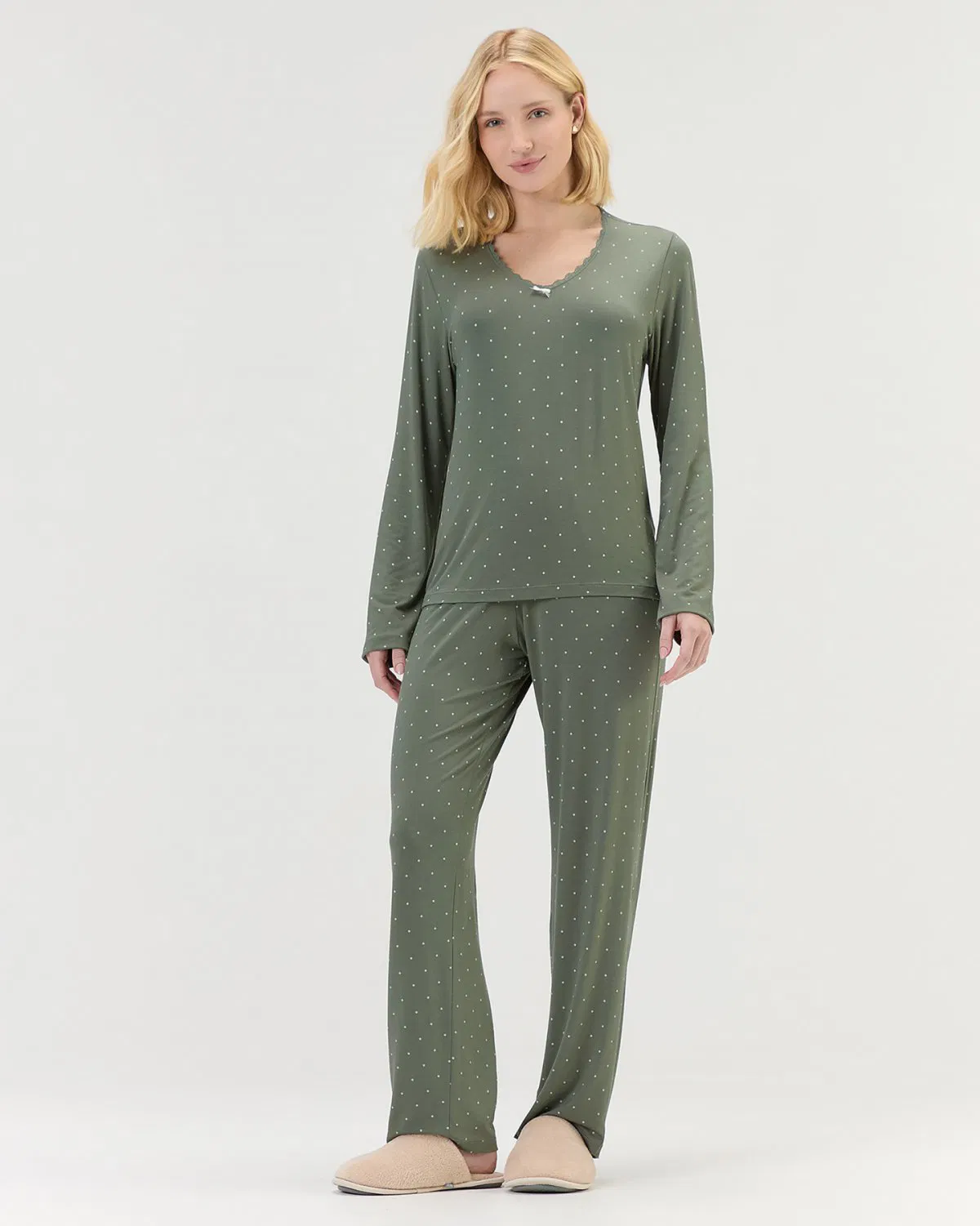 Pijama feminino de manga longa com calça verde poá feito em malha visco comfy, garantindo leveza e maciez com um toque de sofisticação. Decote V com acabamento em renda e detalhe com lacinho de cetim; estampa de poá discreta completando o visual com elegância. Modelo veste tamanho P. |