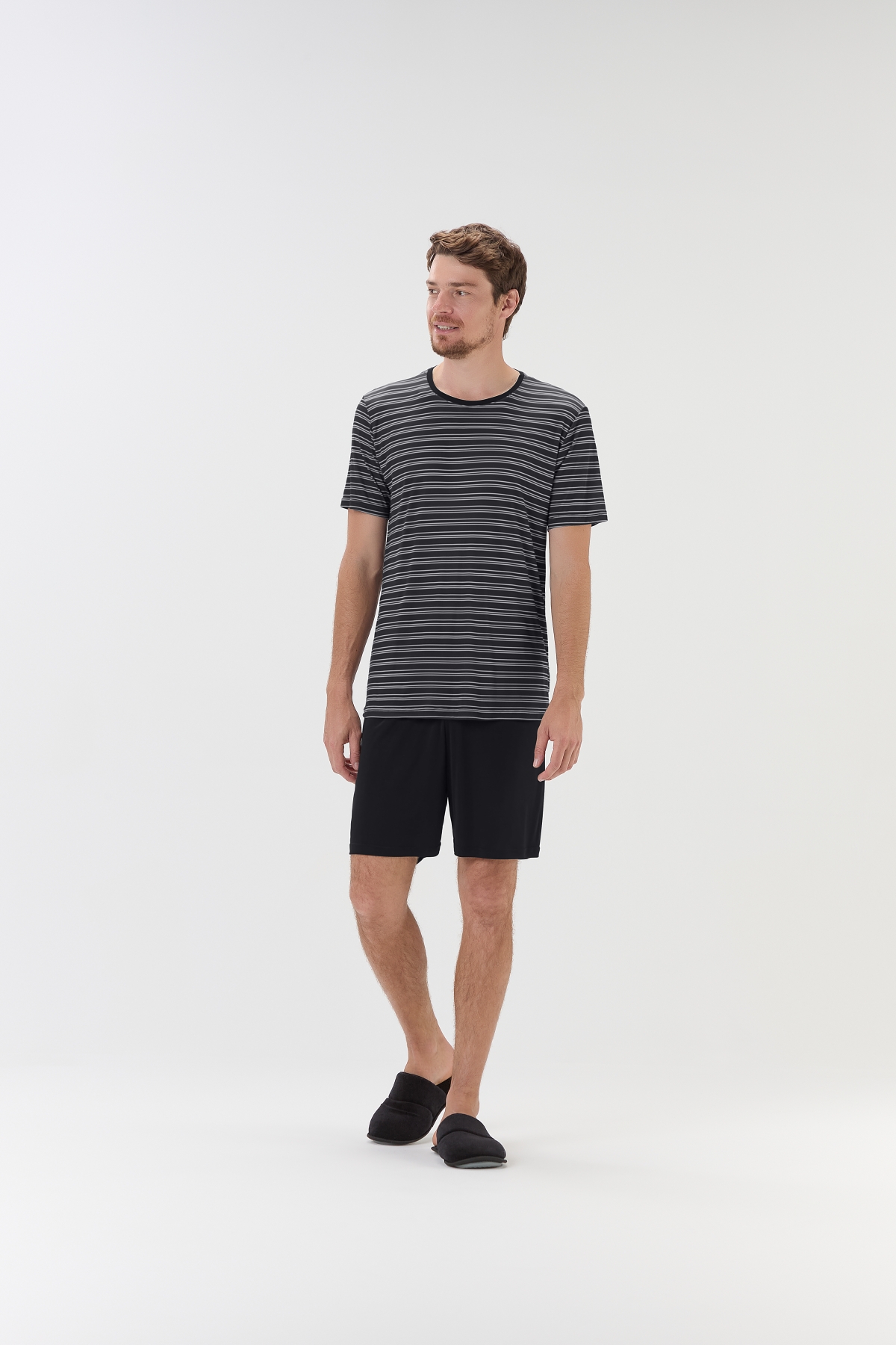 Conforto, leveza e estilo para suas noites! Este pijama masculino é confeccionado em microfibra de alta qualidade, macia, respirável e com toque suave, proporcionando sensação de frescor e liberdade de movimento durante o descanso. A blusa de manga curta apresenta fundo preto com estampa de listras horizontais em fio tinto, trazendo um visual moderno e elegante. A bermuda lisa combinando garante conforto total e praticidade, completando o conjunto de forma versátil e casual. Modelo veste tamanho M. |