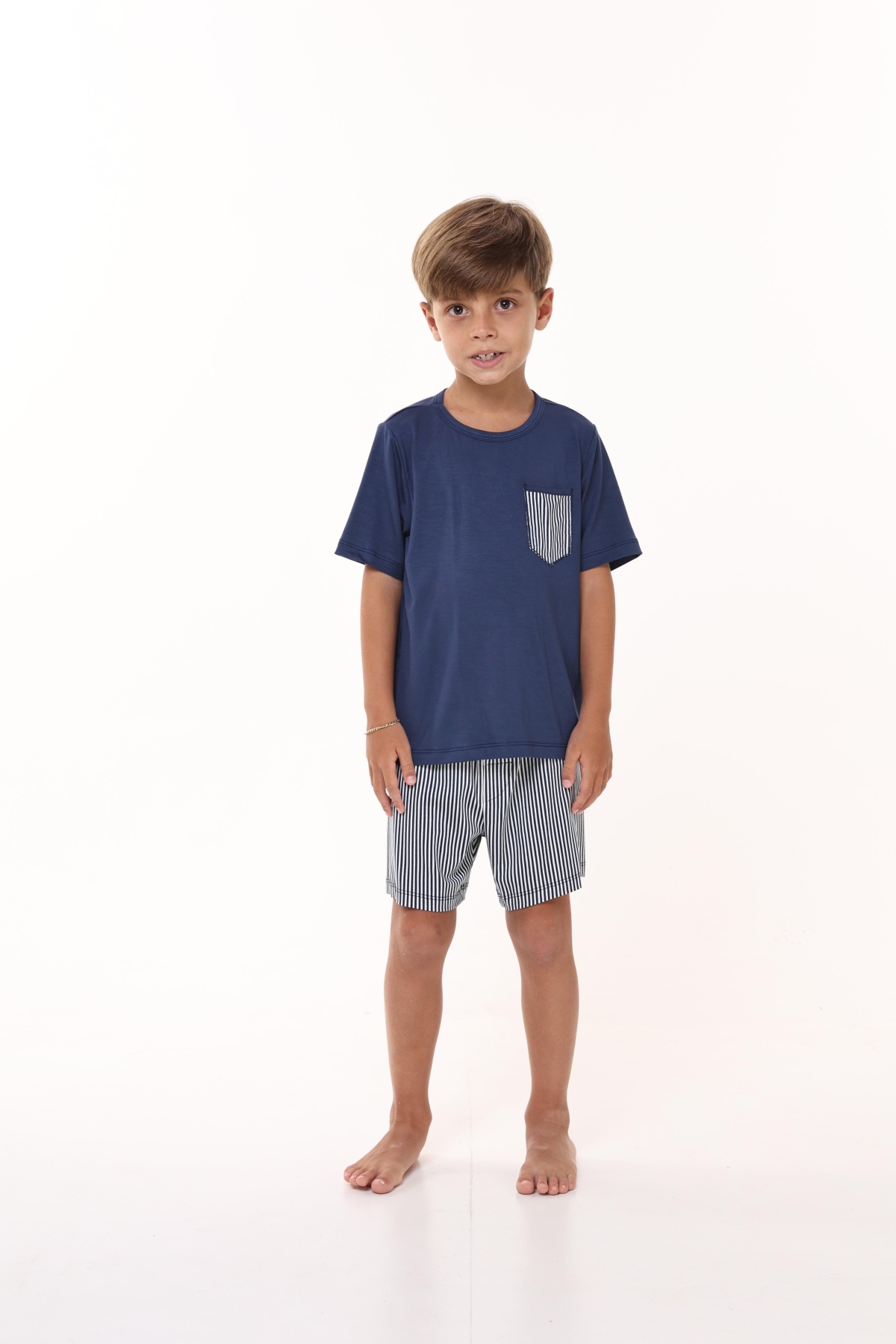 Conforto e estilo para as noites de descanso! Este pijama masculino curto é confeccionado em viscose macia, oferecendo toque suave, frescor e caimento leve, perfeito para quem busca bem-estar em todas as estações. A blusa possui manga curta e vem no tom azul marinho, com bolso frontal contrastante que adiciona um charme moderno ao visual. A bermuda em azul claro listrado completa o conjunto, trazendo um ar casual e elegante, além de garantir total liberdade de movimento durante o sono. Este modelo faz parte de um coordenado para toda a família. |