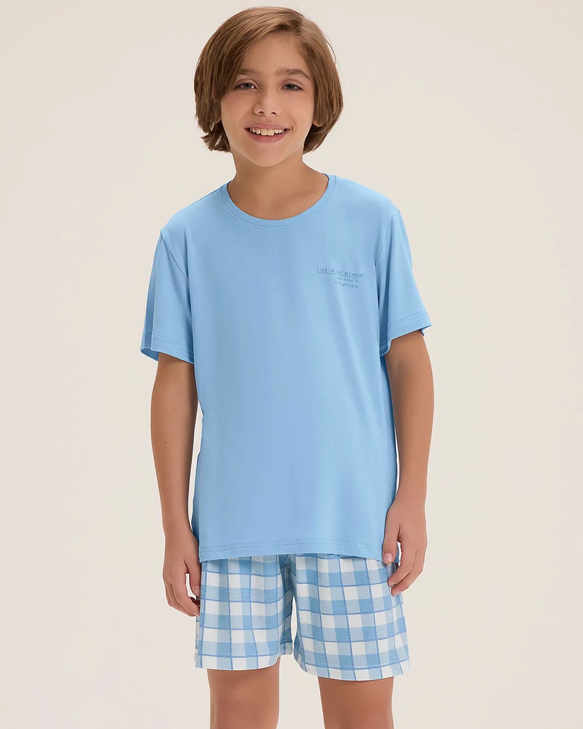 Para noites leves e cheias de conforto! Este pijama infantil masculino é feito em malha visco comfy, com toque macio e fresquinho, ideal para acompanhar os pequenos nas horas de descanso. A camiseta azul clara tem modelagem soltinha e traz uma estampa localizada com a frase “Live in the moment – and make it unforgettable” (Viva o momento – e faça isso inesquecível), despertando imaginação e bons sonhos. A bermuda tem fundo off white com estampa de xadrez tartan em tons de azul, um clássico repaginado em versão moderna e divertida. O cós com elástico garante ajuste confortável para brincar antes de dormir ou relaxar com liberdade. |