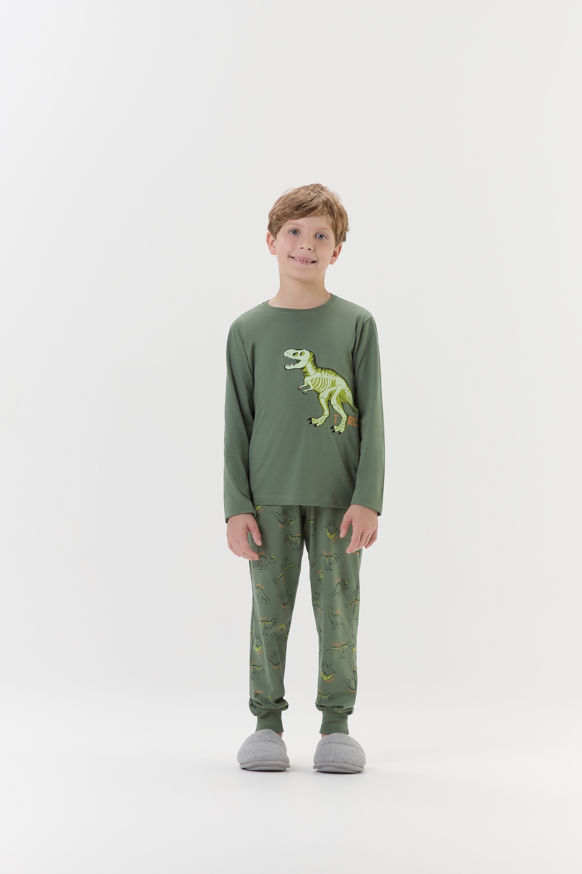 Este pijama masculino juvenil de manga longa e calça é a combinação perfeita de estilo e conforto para as noites mais frescas. Confeccionado em malha macia no tom verde oliva, o conjunto destaca-se pela estampa central de um Tiranossauro Rex que brilha no escuro, garantindo a diversão dos pequenos aventureiros na hora de dormir. |