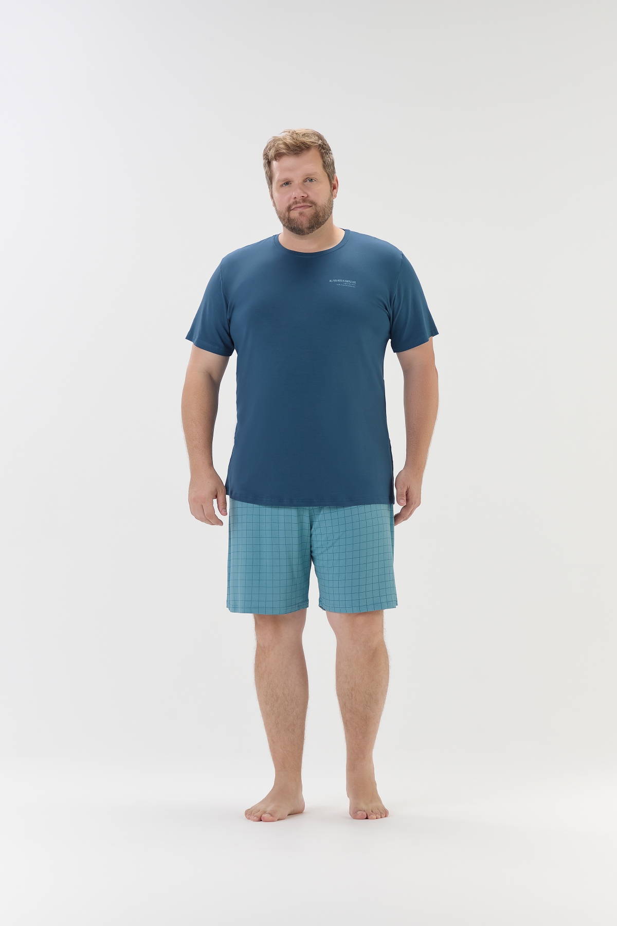 | Para quem valoriza conforto sem abrir mão de estilo. Confeccionado em malha visco comfy, esse pijama oferece toque macio, caimento leve e frescor ideal para as noites de descanso. A blusa de manga curta é lisa, na cor azul escuro, e traz estampa localizada no peito com a frase: ‘All you need is simple life, enjoy the now full of good moments’ (Tudo o que você precisa é de uma vida simples. Aproveite o agora, cheio de bons momentos), refletindo uma vibe leve e tranquila. A bermuda tem fundo azul com estampa de xadrez grid em tom sur tom, garantindo um visual moderno e discreto. Perfeito para relaxar com conforto e atitude. Modelo veste tamanho G1. |