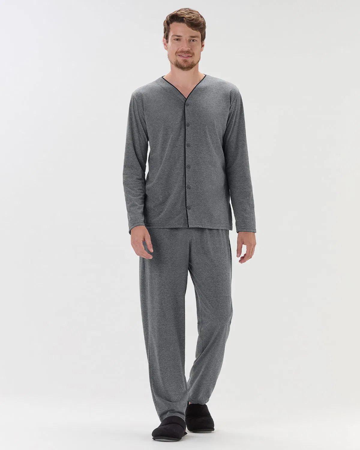 Pijama masculino manga longa com calça na cor mescla, com blusa de abertura frontal e filete, desenvolvido para oferecer conforto e praticidade. O tecido macio garante bem-estar e liberdade de movimento, enquanto o detalhe do filete adiciona um toque moderno e sofisticado ao conjunto. Uma opção versátil e elegante para noites de descanso. Modelo veste tamanho M. |