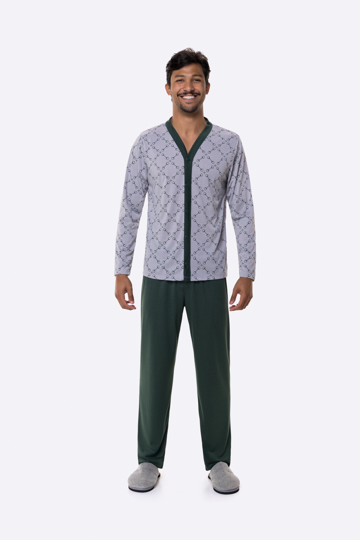 | Este pijama masculino de manga longa e calça é a escolha perfeita para quem busca sofisticação e bem-estar em um conjunto de inverno. Confeccionado em Noble Touch, o tecido proporciona um toque aveludado superior e excelente conforto térmico para as noites mais frias. A blusa, no clássico estilo cardigã, possui abertura frontal completa com fechamento por botões, decote em "V" e acabamento em viés verde-escuro contrastante que confere um visual refinado. Em tom cinza mescla, a peça destaca-se pela estampa rotativa geométrica moderna e discreta. A calça longa, na cor verde-bandeira sólida, apresenta modelagem reta e confortável, com cós elástico que garante ajuste perfeito sem apertar. Prático e elegante, este modelo une a facilidade da abertura frontal com a maciez de um tecido premium, sendo ideal para relaxar em casa com máximo estilo. |