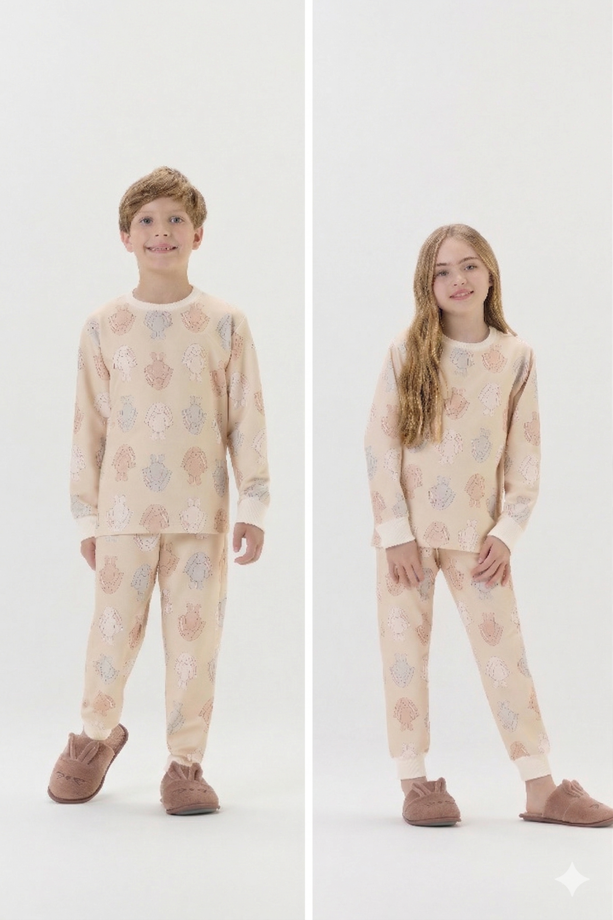 PIJAMA UNISSEX JUVENIL LONGO MOLETINHO BEGE COELHINHOS - COR COM AMOR