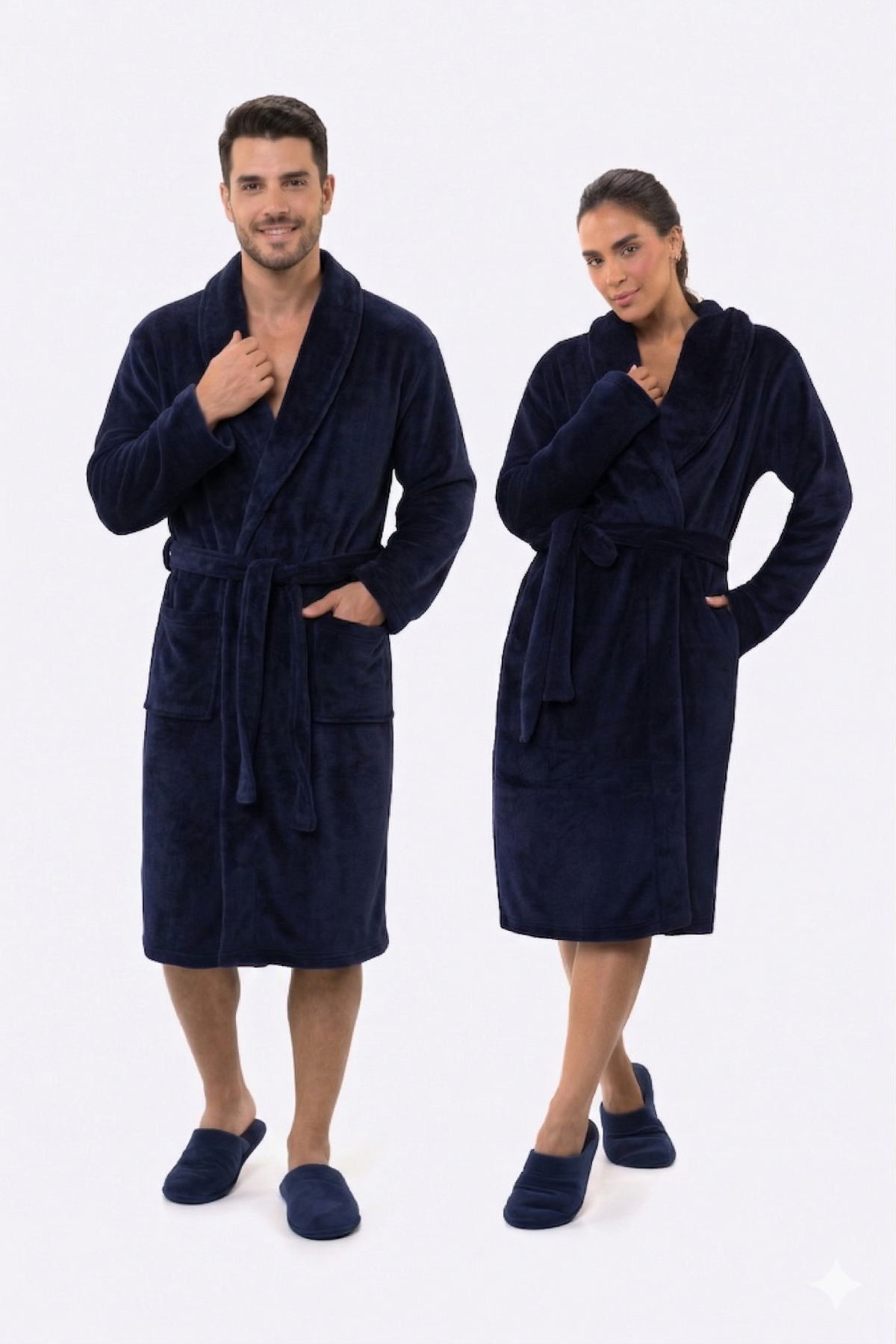 | Este roupão unissex em azul marinho é o sinônimo de aconchego absoluto para os momentos de relaxamento em casa. Confeccionado em Fleece Premium, ele oferece um toque extremamente macio e aveludado, funcionando como um excelente isolante térmico para os dias mais frios. Sua modelagem versátil apresenta mangas longas, gola acolchoada e bolsos frontais funcionais, garantindo praticidade no uso diário. O fechamento por amarrador na cintura permite um ajuste personalizado ao corpo, proporcionando total liberdade de movimento. Com um design clássico e durável, este roupão combina o conforto de um hotel de luxo com a praticidade necessária para o homewear, mantendo sua textura suave mesmo após sucessivas lavagens. |