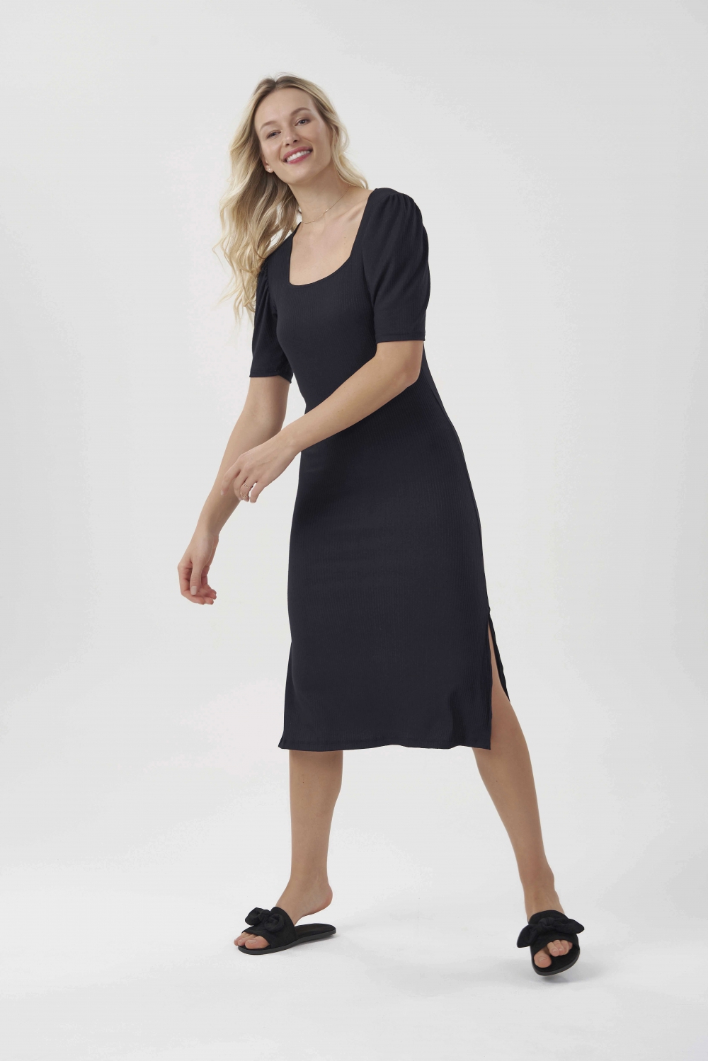 CA12479CCDress em ribana canelada super confortável! Detalhe nas mangas com franzido dando mais volume e deixando a peça mais delicada. Modelagem comprimento Midi com abertura nas laterais.Modelo veste P. |