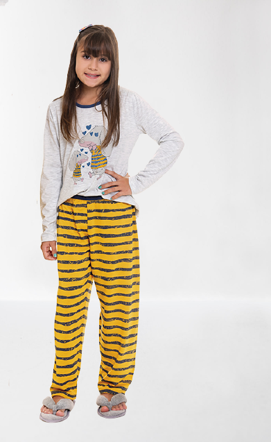 Pijama de inverno feminino ,Blusa na cor mescla com gola redonda com detalhes de viés no azul marinho e estampa fofa de cachorrinhos ,Calça listrada de amarelo e azul marinho dando um tom super alegre ao pijama ,uma ótima opção para os dias de inverno com a familia . Modelo possui opção mãe e filha . |