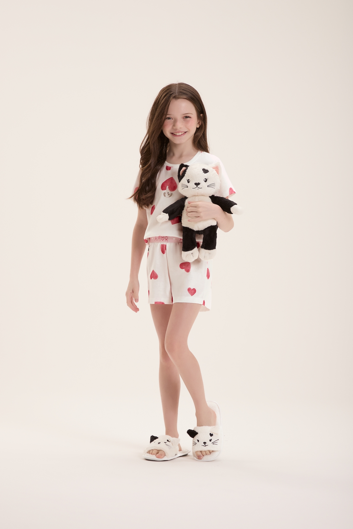 Conjunto de pijama feminino infantil em malha comfort, ele traz uma estampa fofa de corações no fundo off white, com as divertidas aparições dos novos mascotes da marca: uma gatinha frajola espertinha e um cachorrinho branco com orelhinhas cinza, que prometem conquistar as pequenas. O shorts acompanha a blusa com cós de elástico estampado de 3 cm, onde se destaca a palavra “Amor” intercalada com um pequeno coração, em um detalhe carinhoso que completa o visual. A modelagem confortável é perfeita para acompanhar a rotina noturna com liberdade e muito estilo. Um conjunto ideal para dormir com alegria e acordar rodeada de fofura! |