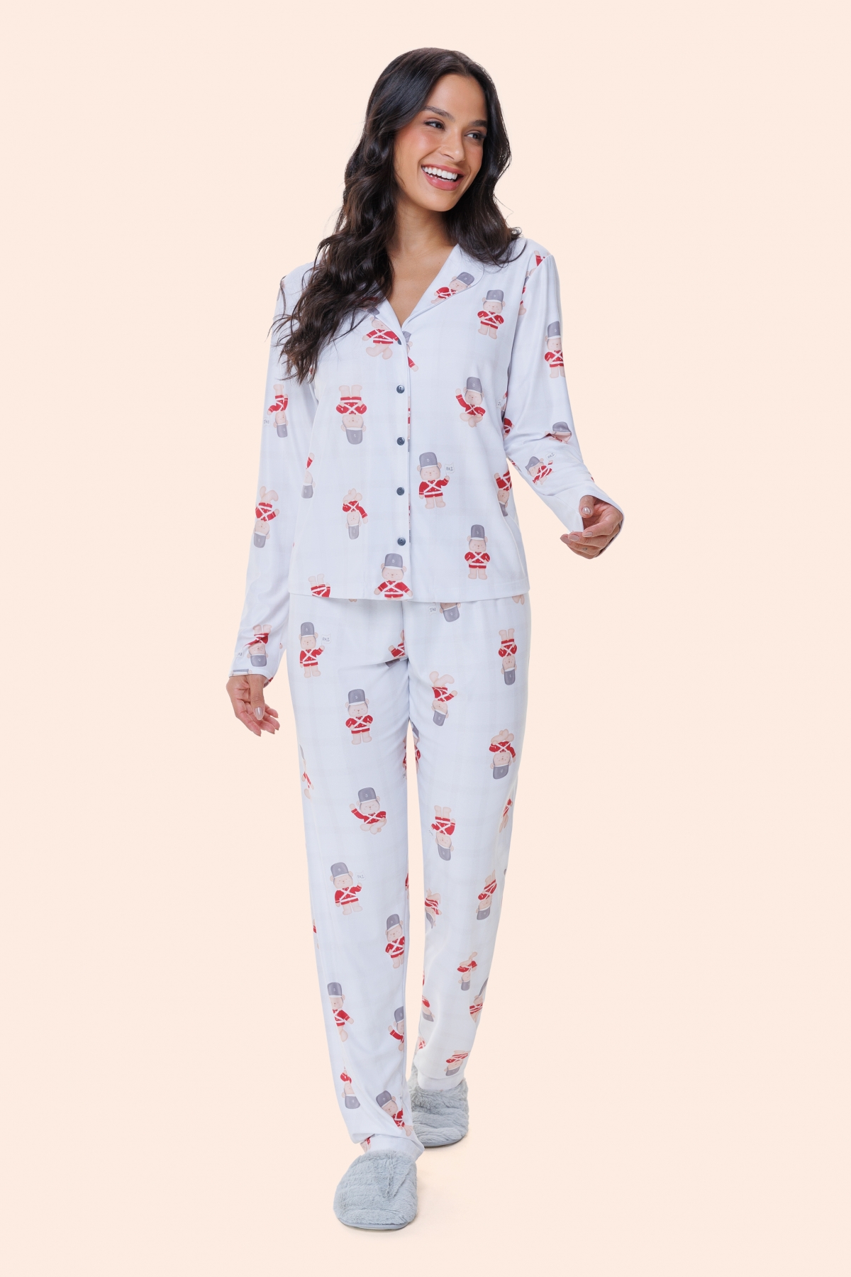 Esse pijama em Light Suede é perfeito para noites aconchegantes. A blusa de manga longa e fechamento frontal por botões facilita o uso, proporcionando praticidade, especialmente para gestantes e lactantes, facilitando o vestir e a amamentação. A calça reta combina praticidade e charme. Sua estampa de soldadinhos adiciona um toque delicado e clássico, enquanto o tecido macio garante máximo conforto. |